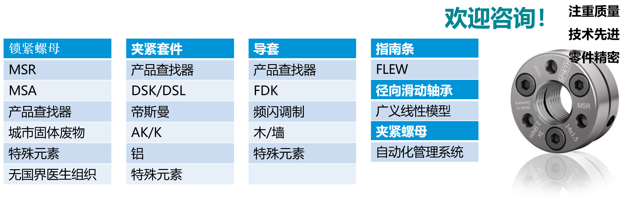 更高的功率密度、不斷增加的動態(tài)應(yīng)力和緊張的預(yù)算:機(jī)械工程要求需要高質(zhì)量的軸轂連接元件。Spieth 夾緊套件和夾緊元件是摩擦鎖定的軸轂連接,可提供全方位壓力。得益于Spieth 原理,它們更加準(zhǔn)確、精密、高效、易于組裝且更易于維護(hù)。Spieth 產(chǎn)品的特點(diǎn)是一流的品質(zhì)和精度。為了輕松識別適合您個人應(yīng)用要求的產(chǎn)品,您可以使用我們網(wǎng)站上提供的產(chǎn)品查找器。