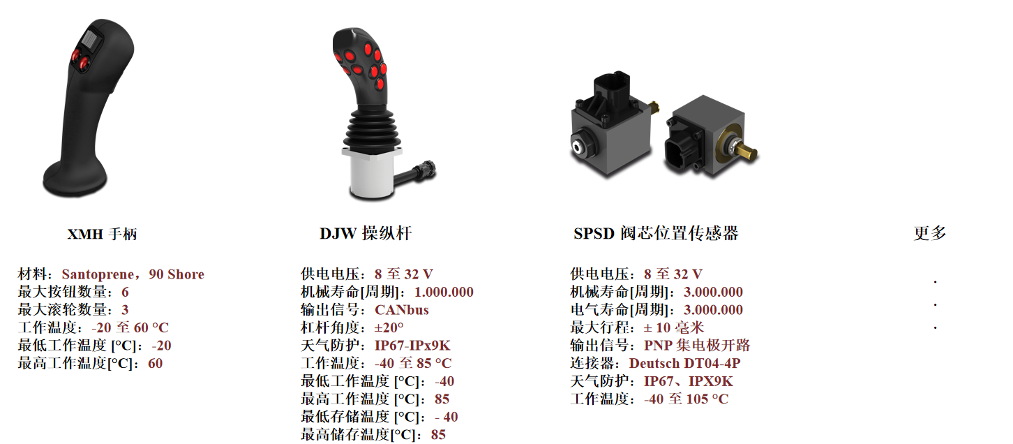 Walvoil在該方面的產(chǎn)品包括手柄、操作桿、閥芯位置傳感器、電子控制單元等等,更多產(chǎn)品詳情可前往官網(wǎng)了解。符合人體工學(xué)的新型中型手柄,帶有柔軟的觸感涂層,握持舒適。對稱設(shè)計使其適合右手和左手應(yīng)用。操作員側(cè)最多有 4 個控制元件(指輪、按鈕、搖桿開關(guān))。作為選項,可以使用位于手柄另一側(cè)的 FNR 開關(guān)。新型 Walvoil 操縱桿專為高達(dá)性能級別 d / SIL 2 的安全相關(guān)應(yīng)用而設(shè)計,它完全密封并防止水和灰塵進入 (IP67/IPx9K)。憑借大量的輸入引腳,操縱桿可以收集手柄的所有信號(指輪、按鈕、搖桿開關(guān)等),并使用 SAE J1939、CANopen、CANopen Safety 或 ISOBUS 協(xié)議通過 CANbus 網(wǎng)絡(luò)發(fā)送這些信號。