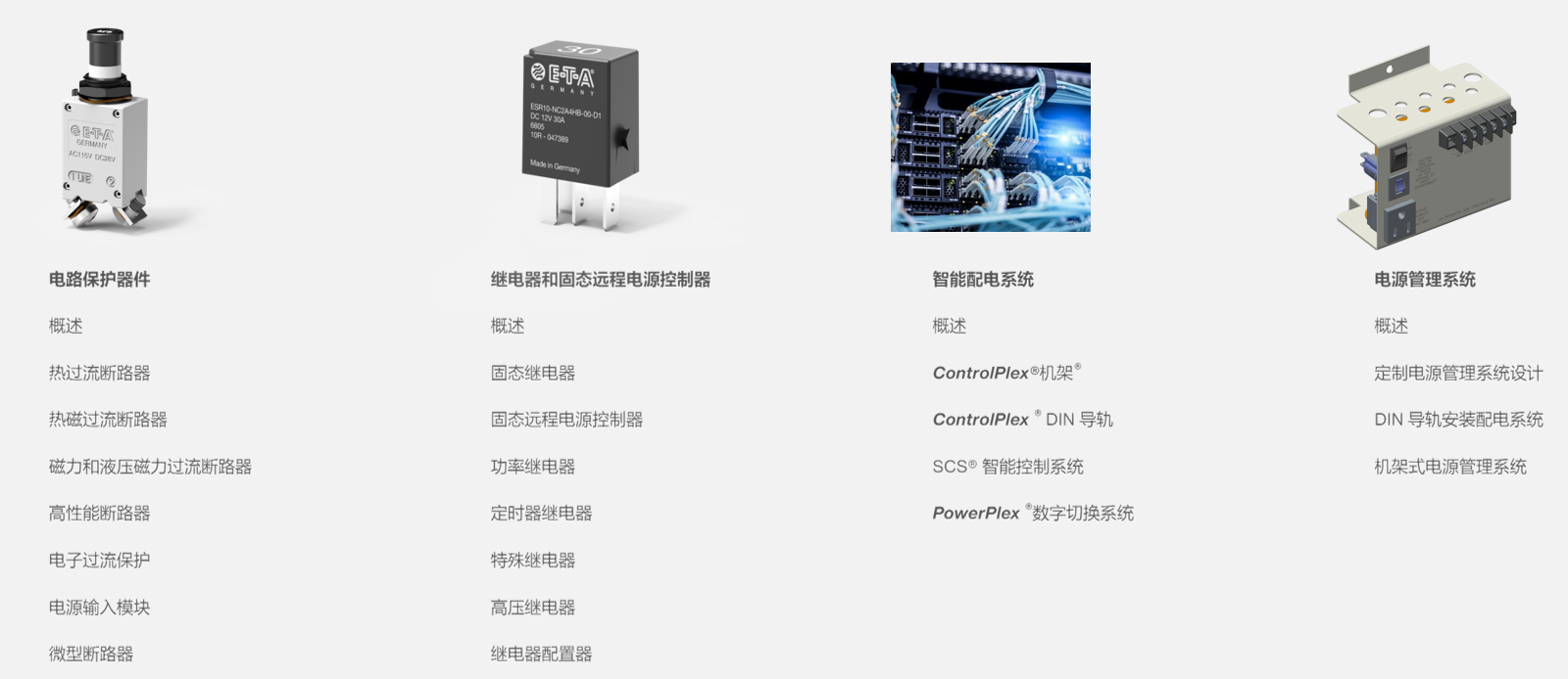 ETA 提供全面的電子設備保護解決方案。請選擇所需的產(chǎn)品類別,詳細了解 ETA 的熱斷路器、熱磁斷路器、磁斷路器、高性能斷路器和電子斷路器。